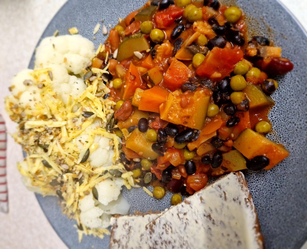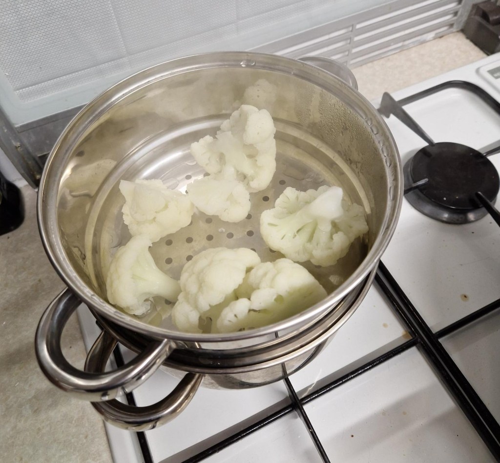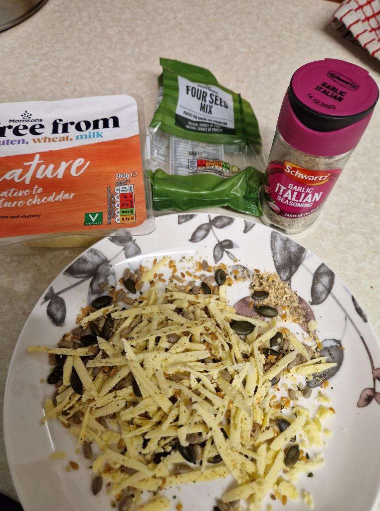 In the meantime I steamed some cauliflower. And while that was cooking, I grated some cheese, added Italian Garlic and 4 seed mix, to sprinkle on top of the cauliflower.