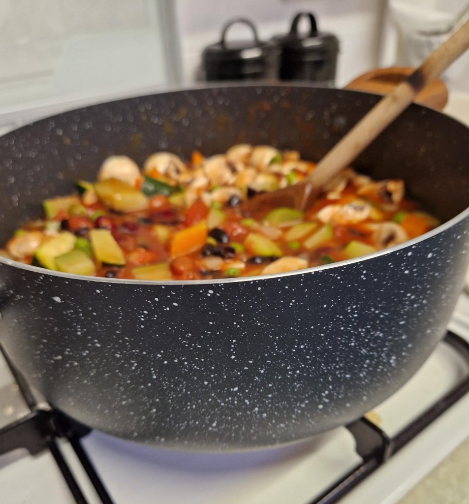 I always like to make cooking as simple as possible. So take a nice big pan and put everything in there together.